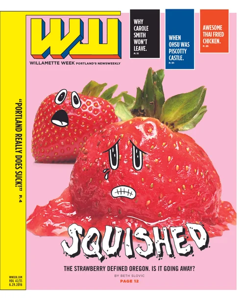 The cover story for this issue was about the struggling strawberry industry in Oregon. We bought strawberries from different grocery stores and found the cheapest were the nicest to look at. I shot this cover photo on my iPhone using natural light from a window in the office. Our illustration intern Jodie Beechem drew the faces and headline. This was the first issue we tried out a 3D WW logo.